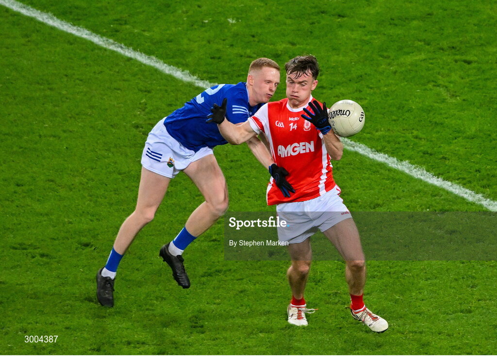 30 November 2024; Niall O'Callaghan of Cuala in action against Páraic McKenny of Ardee St Mary's during the AIB Leinster GAA Senior Club Football Championship final match between Cuala of Dublin and Ardee St Mary's of Louth at Croke Park in Dublin. Photo by Stephen Marken/Sportsfile