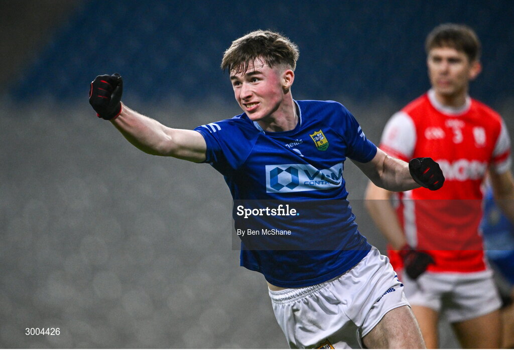 30 November 2024; Seán Callaghan of Ardee St Mary's celebrates after scoring his side's second goal during the AIB Leinster GAA Senior Club Football Championship final match between Cuala of Dublin and Ardee St Mary's of Louth at Croke Park in Dublin. Photo by Ben McShane/Sportsfile