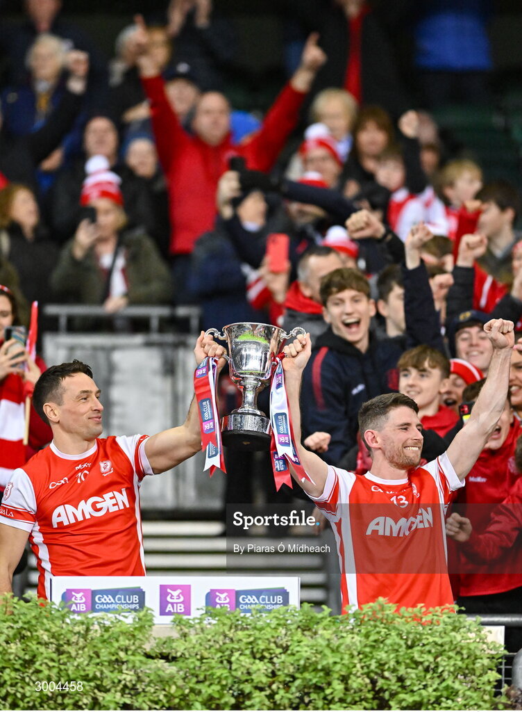 30 November 2024; Cuala captain James Power, left, and teammate Luke Keating lift the Seán McCabe Cup after the AIB Leinster GAA Senior Club Football Championship final match between Cuala of Dublin and Ardee St Mary's of Louth at Croke Park in Dublin. Photo by Piaras Ó Mídheach/Sportsfile