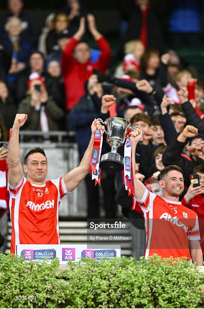 30 November 2024; Cuala captain James Power, left, and teammate Luke Keating lift the Seán McCabe Cup after the AIB Leinster GAA Senior Club Football Championship final match between Cuala of Dublin and Ardee St Mary's of Louth at Croke Park in Dublin. Photo by Piaras Ó Mídheach/Sportsfile