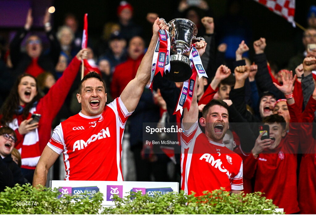 30 November 2024; Cuala captain James Power, left, and teammate Luke Keating lift the McCabe Cup after his side's victory in the AIB Leinster GAA Senior Club Football Championship final match between Cuala of Dublin and Ardee St Mary's of Louth at Croke Park in Dublin. Photo by Ben McShane/Sportsfile