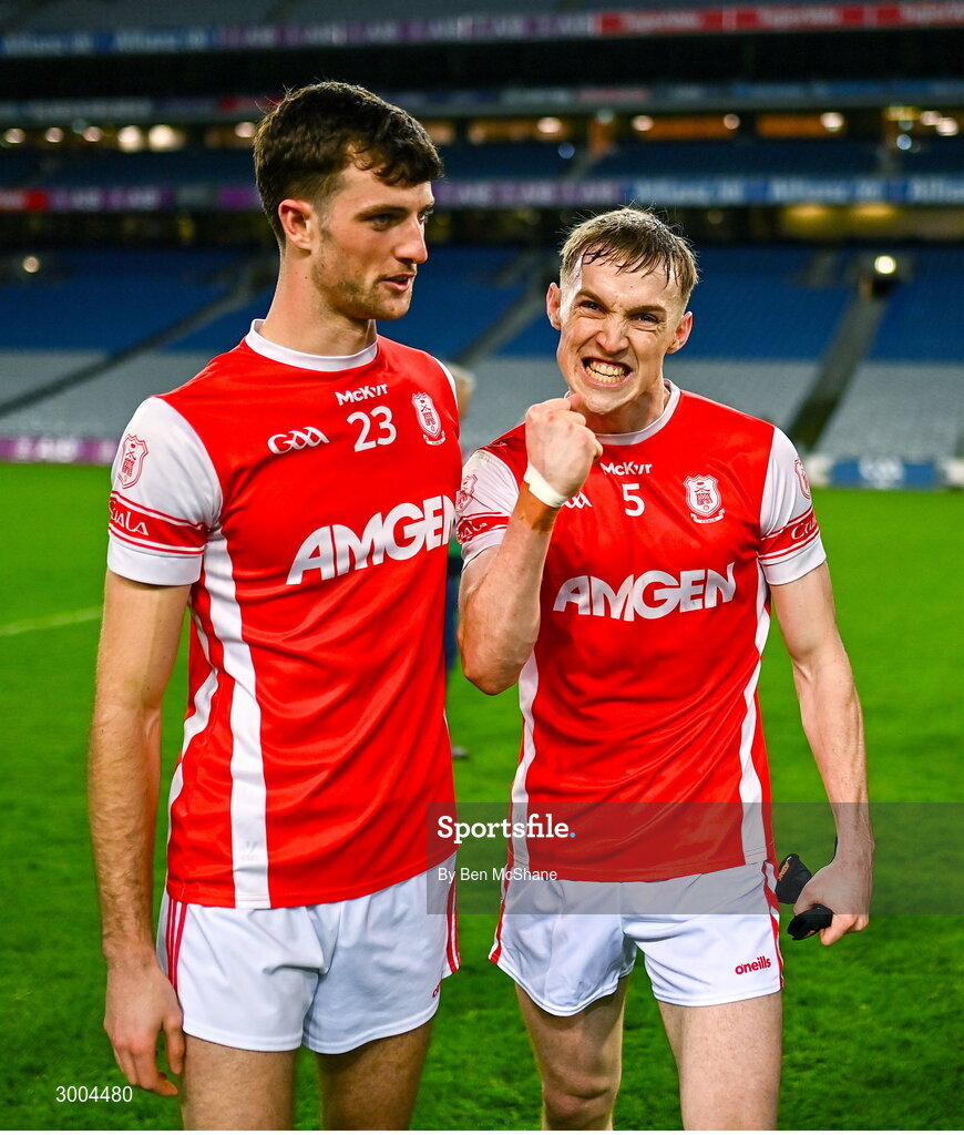 30 November 2024; Cillian Dunne, left, and Eoin Kennedy of Cuala celebrate after the AIB Leinster GAA Senior Club Football Championship final match between Cuala of Dublin and Ardee St Mary's of Louth at Croke Park in Dublin. Photo by Ben McShane/Sportsfile