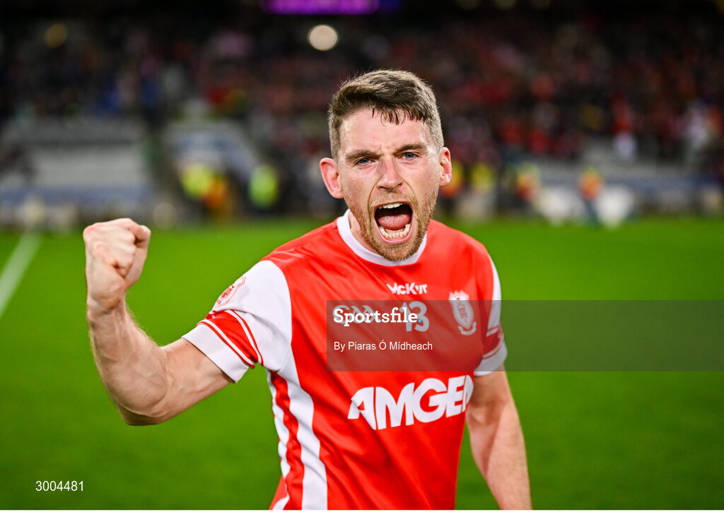 30 November 2024; Luke Keating of Cuala celebrates after securing victory with a winning point from a free during the AIB Leinster GAA Senior Club Football Championship final match between Cuala of Dublin and Ardee St Mary's of Louth at Croke Park in Dublin. Photo by Piaras Ó Mídheach/Sportsfile