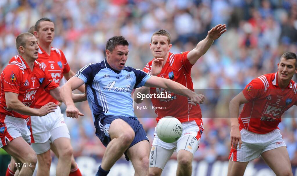 8 June 2008; Éamon Fennell, Dublin, in action against Ray Finnegan, 7, Conor McGuinness, 6, Ronan Carroll and Des Finnegan, 2, Louth. GAA Football Leinster Senior Championship Quarter-Final, Louth v Dublin, Croke Park, Dublin. Picture credit: Matt Browne / SPORTSFILE