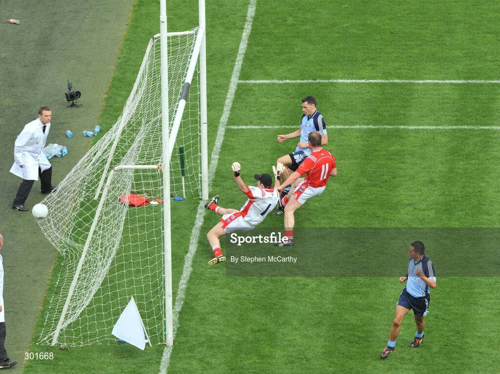 8 June 2008; Alan Brogan, Dublin, shoots to score his side's goal past Louth goalkeeper Stuart Reynolds and Mark Stanfield. GAA Football Leinster Senior Championship Quarter-Final, Louth v Dublin, Croke Park, Dublin. Picture credit: Stephen McCarthy / SPORTSFILE