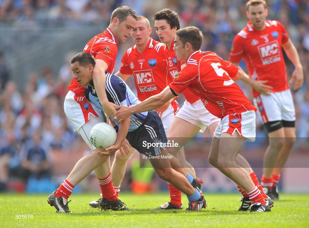 8 June 2008; Jason Sherlock, Dublin, in action against Louth players, left to right, Shane Lennon, Ray Finnegan, Brian White and John O'Brien. GAA Football Leinster Senior Championship Quarter-Final, Louth v Dublin, Croke Park, Dublin. Picture credit: David Maher / SPORTSFILE