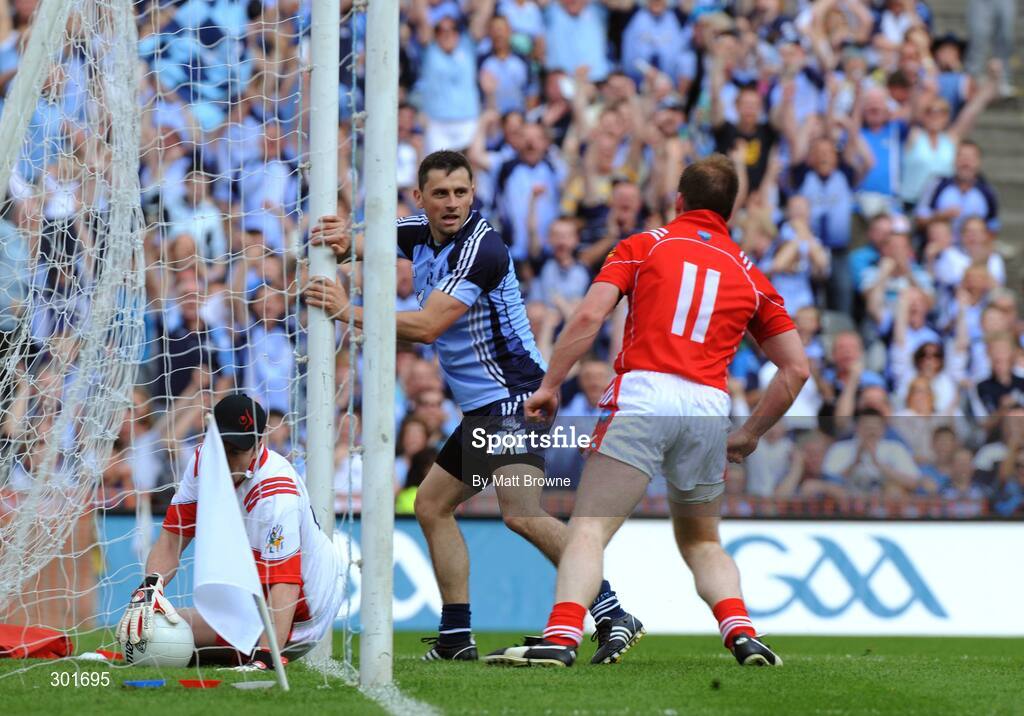8 June 2008; Dublin's Alan Brogan after scoring a goal despite the attempts of Louth's Mark Stanfield, 11, and Stuart Reynolds. GAA Football Leinster Senior Championship Quarter-Final, Louth v Dublin, Croke Park, Dublin. Picture credit: Matt Browne / SPORTSFILE