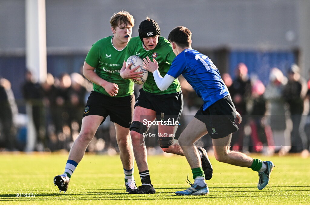 2 January 2025; Ollie Molloy of South East is tackled by Harry Ward of North Midlands during the BearingPoint Shane Horgan Cup Round 3 match between South East and North Midlands at Shay Murtagh Park in Mullingar, Westmeath. Photo by Ben McShane/Sportsfile