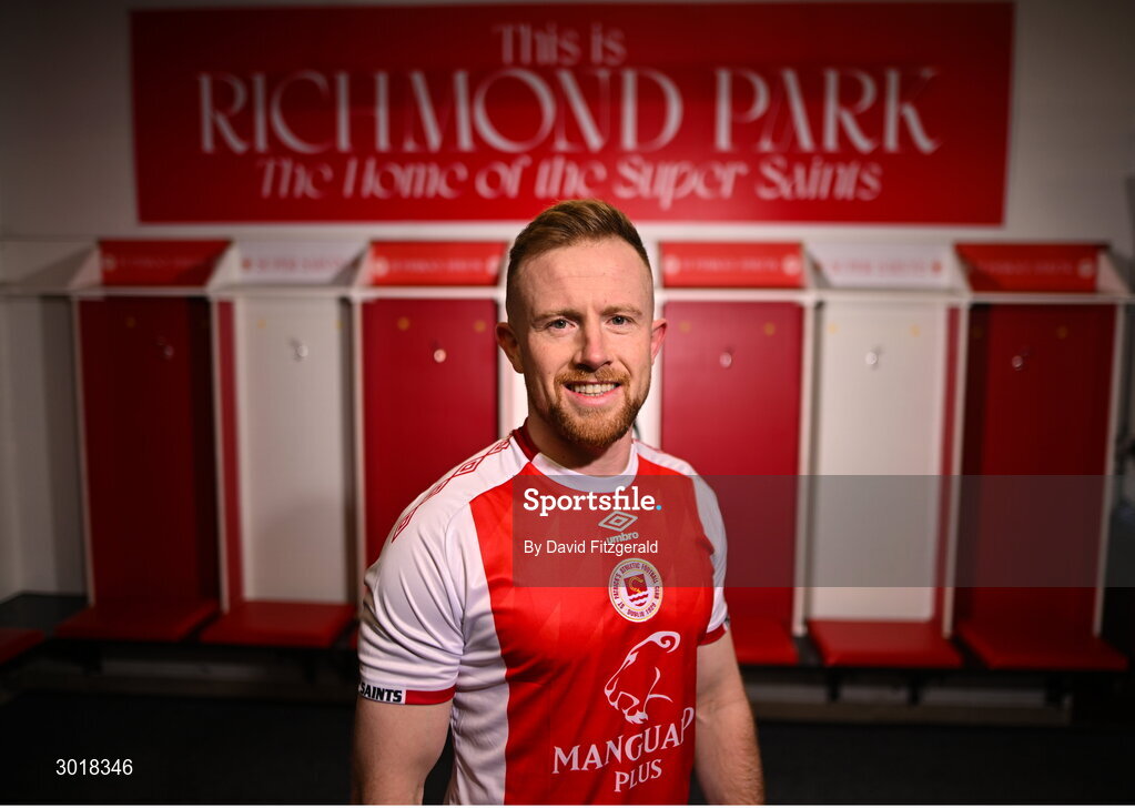 2 January 2025; St Patrick's Athletic new signing Sean Hoare stands for a portrait during his unveiling at Richmond Park in Dublin. Photo by David Fitzgerald/Sportsfile