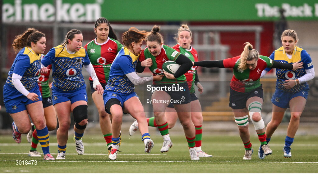 4 January 2025; Enya Breen of Clovers is tackled by Carys Hughes of Gwalia Lightning during the Celtic Challenge match between Clovers and Gwalia Lightning at Kingspan Stadium in Belfast. Photo by Ramsey Cardy/Sportsfile