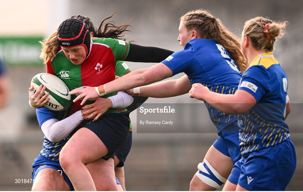 4 January 2025; Beth Buttimer of Clovers is tackled by Molly Anderson-Thomas, left, and Gwennan Hopkins of Gwalia Lightning during the Celtic Challenge match between Clovers and Gwalia Lightning at Kingspan Stadium in Belfast. Photo by Ramsey Cardy/Sportsfile