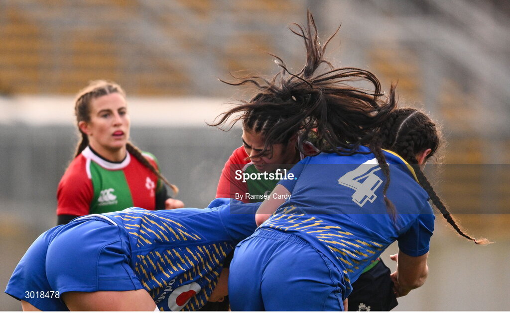 4 January 2025; Ivana Kiripati of Clovers is tackled by Paige Jones, left, and Lily Terry of Gwalia Lightning during the Celtic Challenge match between Clovers and Gwalia Lightning at Kingspan Stadium in Belfast. Photo by Ramsey Cardy/Sportsfile