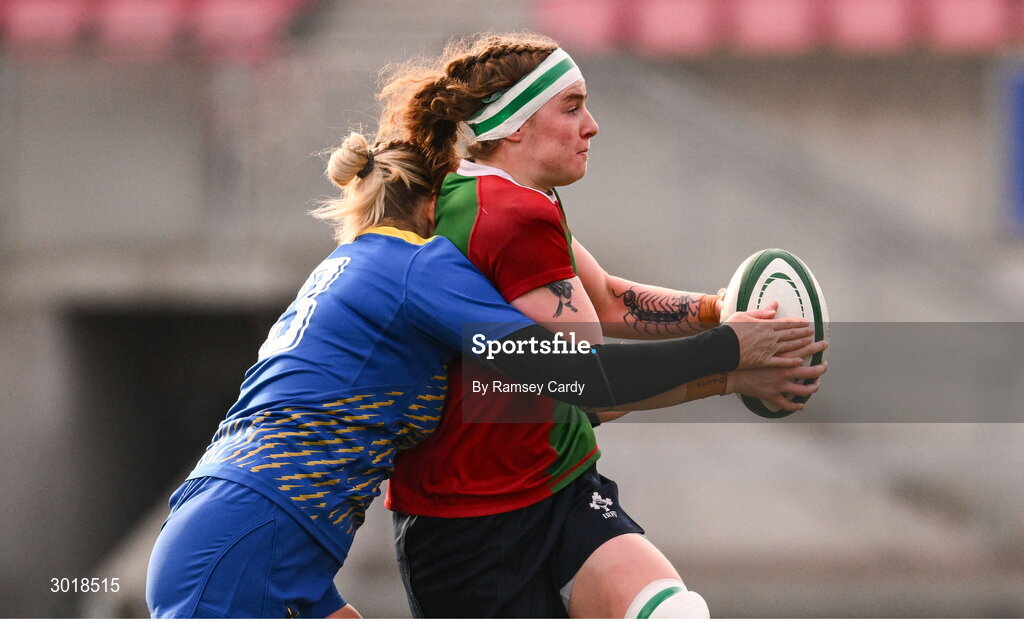 4 January 2025; Ruth Campbell of Clovers is tackled by Carys Williams-Morris of Gwalia Lightning during the Celtic Challenge match between Clovers and Gwalia Lightning at Kingspan Stadium in Belfast. Photo by Ramsey Cardy/Sportsfile