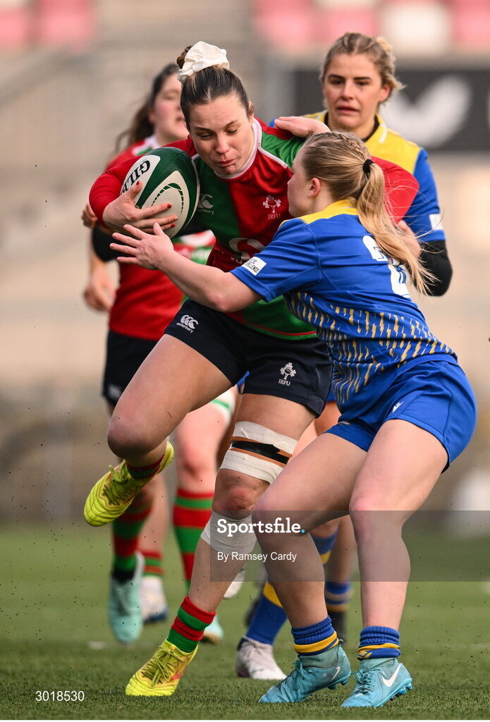 4 January 2025; Alanna McInerney of Clovers is tackled by Seren Lockwoods of Gwalia Lightning during the Celtic Challenge match between Clovers and Gwalia Lightning at Kingspan Stadium in Belfast. Photo by Ramsey Cardy/Sportsfile