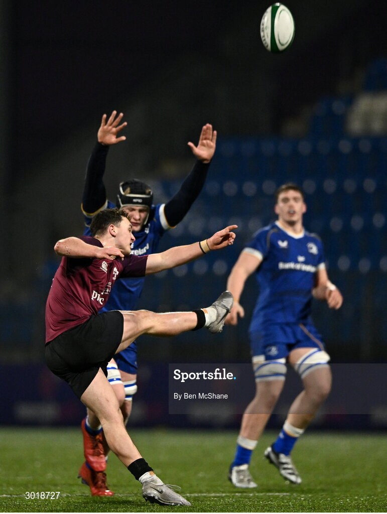 4 January 2025; Sam Wisniewski of Ireland in action against Conor O'Tighernaigh of Leinster during the friendly match between Ireland U20 and Leinster Development XV at Energia Park in Dublin. Photo by Ben McShane/Sportsfile