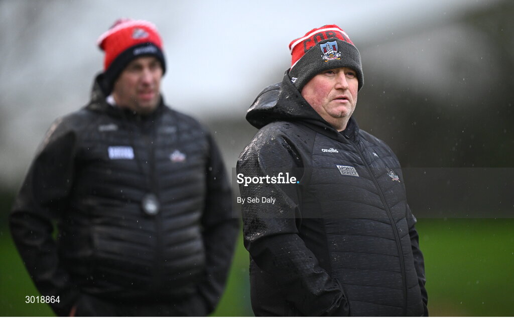 4 January 2025; Cork manager Pat Ryan, right, and selector Donal O'Rourke during the Intercounty Hurling Challenge Match between Waterford and Cork at Fraher Field in Dungarvan, Waterford. Photo by Seb Daly/Sportsfile