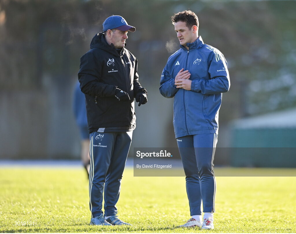 7 January 2025; Munster Head Performance Analyst & Technical Coach George Murray with Billy Burns during Munster Rugby squad training at the University of Limerick in Limerick. Photo by David Fitzgerald/Sportsfile