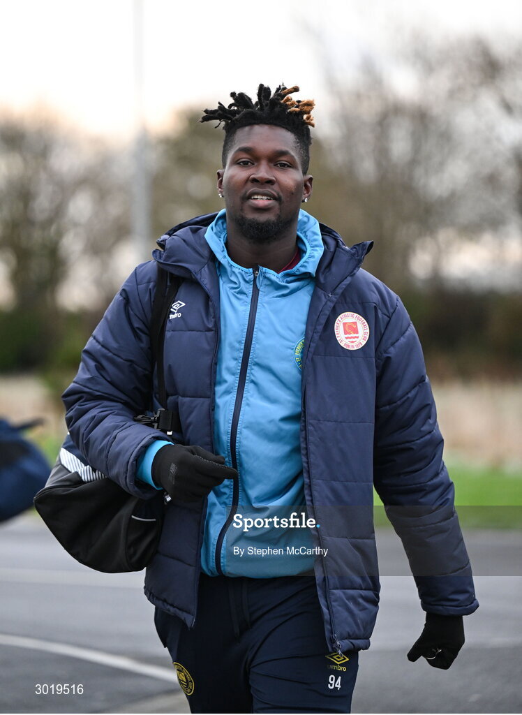 10 January 2025; Goalkeeper Joseph Anang arrives for a St Patrick's Athletic pre-season training session at the National Indoor Arena on the Sport Ireland Campus in Dublin. Photo by Stephen McCarthy/Sportsfile