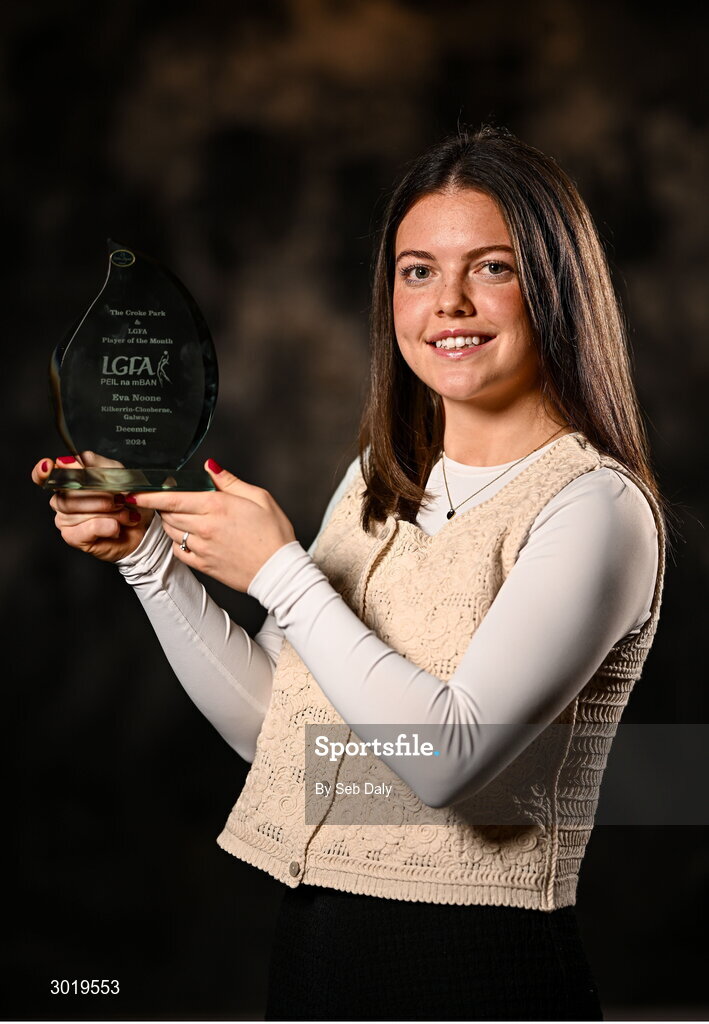 10 January 2025; Eva Noone from Galway club Kilkerrin-Clonberne is pictured with The Croke Park Hotel/LGFA Player of the Month award for December 2024, at The Croke Park Hotel on Jones Road, Dublin. Eva produced an AIB Player of the Match performance, including a scoring haul of 0-3, as Kilkerrin-Clonberne won a fourth successive AIB All-Ireland Senior club title at Croke Park on Saturday December 14. Photo by Seb Daly/Sportsfile