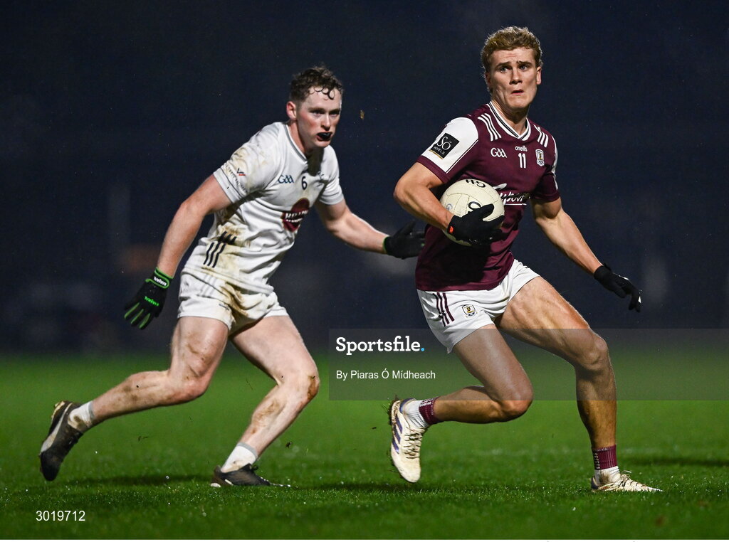 4 January 2025; Sam O'Neill of Galway in action against James McGrath of Kildare during the Intercounty Football Challenge match between Kildare and Galway at Cedral St Conleth's Park in Newbridge, Kildare. Photo by Piaras Ó Mídheach/Sportsfile Photo by Piaras Ó Mídheach/Sportsfile