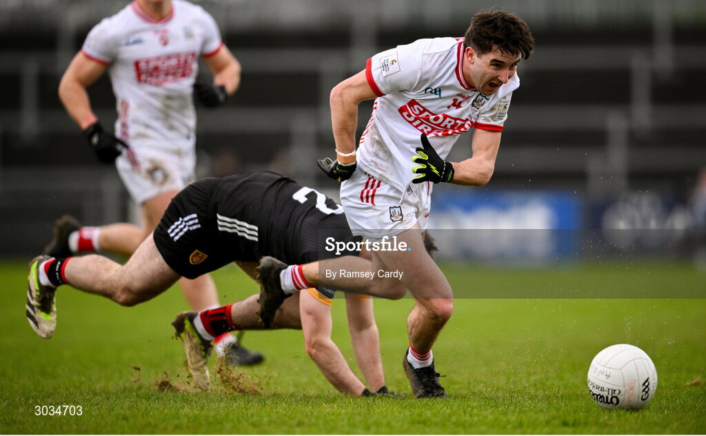 2 February 2025; Chris Og Jones of Cork in action against Peter Fegan of Down during the Allianz Football League Division 2 match between Down and Cork at Páirc Esler in Newry, Down. Photo by Ramsey Cardy/Sportsfile