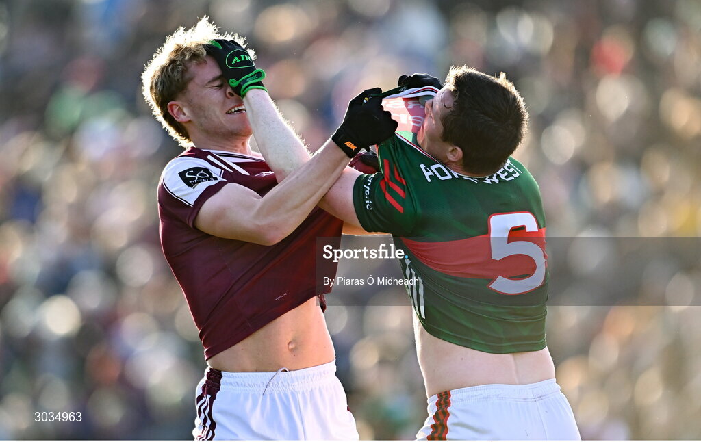 2 February 2025; Sam O'Neill of Galway and Stephen Coen of Mayo tussle off the ball, before both were shown the yellow card by referee Noel Mooney, during the Allianz Football League Division 1 match between Mayo and Galway at Hastings Insurance MacHale Park in Castlebar, Mayo. Photo by Piaras Ó Mídheach/Sportsfile