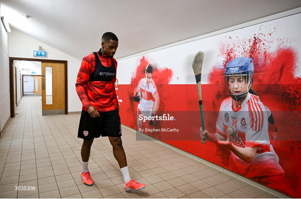 3 February 2025; Derry City's Sadou Diallo makes his way to the training pitch at their new training facility, the Owenbeg Derry GAA Centre, in Dungiven, Derry. Photo by Stephen McCarthy/Sportsfile