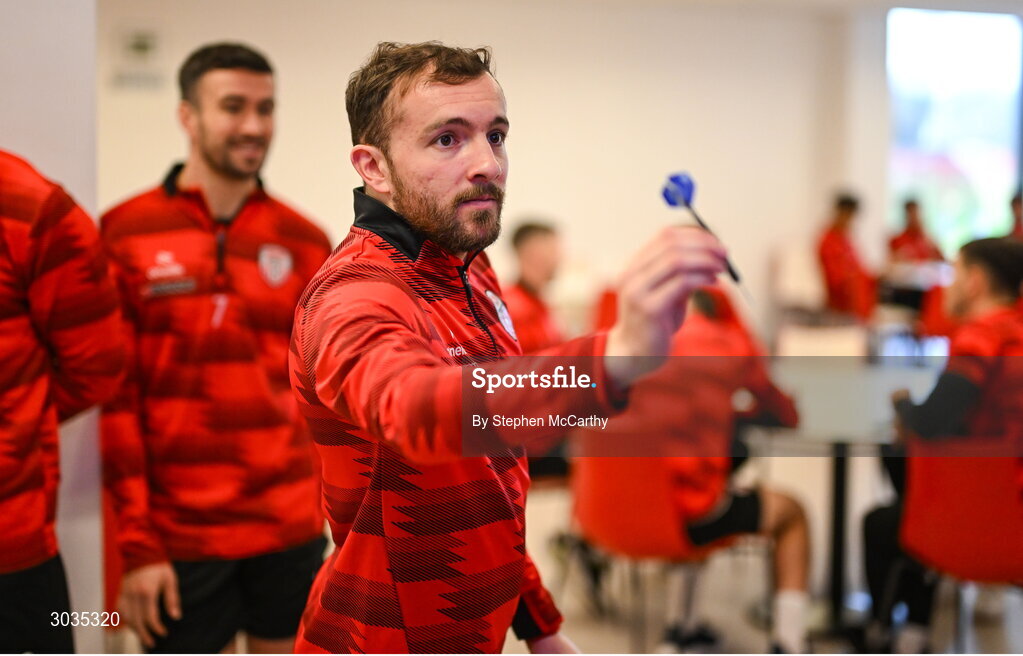 3 February 2025; Derry City's Paul McMullan plays darts as players relax before a team meeting at their new training facility, the Owenbeg Derry GAA Centre, in Dungiven, Derry. Photo by Stephen McCarthy/Sportsfile