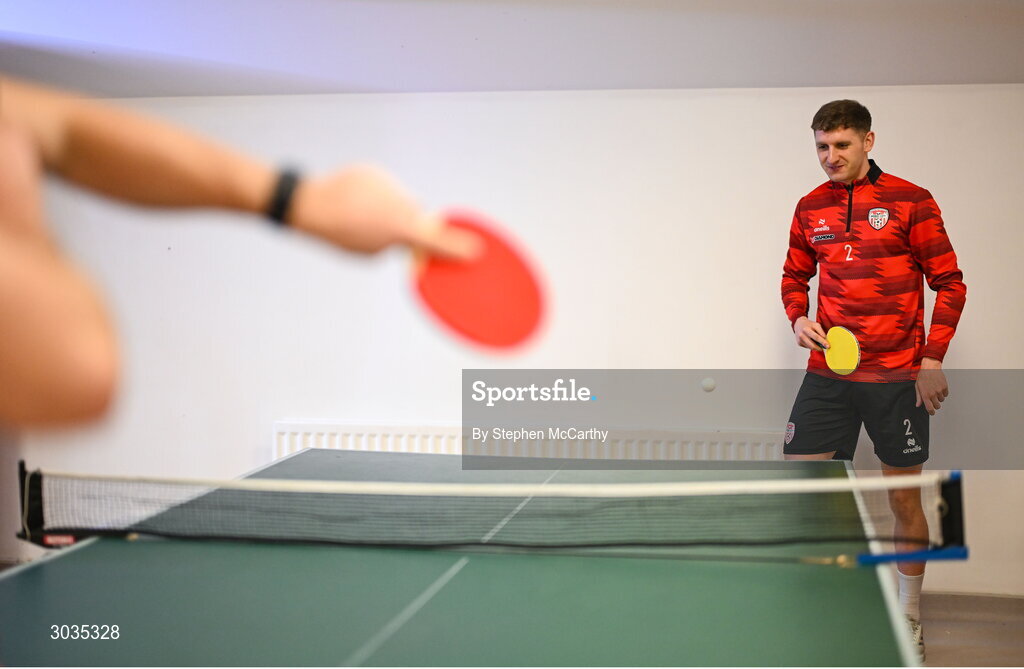 3 February 2025; Derry City's Ronan Boyce plays table tennis as players relax before a team meeting at their new training facility, the Owenbeg Derry GAA Centre, in Dungiven, Derry. Photo by Stephen McCarthy/Sportsfile