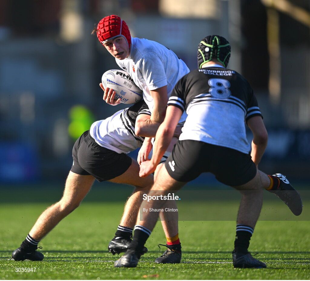 4 February 2025; Ruadhán Murray of Presentation College, Bray is tackled by Adam Hathaway, left, and Saul Brewster of Newbridge College during the Bank of Ireland Leinster Rugby Boys Schools Junior Cup First Round match between Newbridge College and Presentation College, Bray at Energia Park in Dublin. Photo by Shauna Clinton/Sportsfile