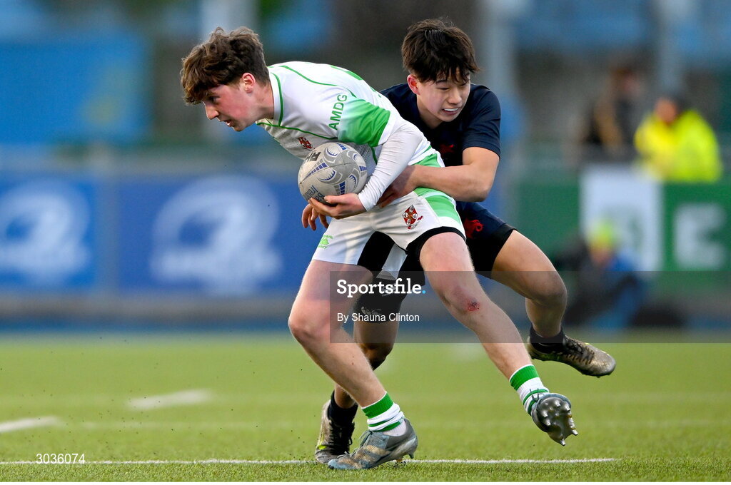 4 February 2025; Oscar Sugrue-Lynch of Gonzaga College in action against Sean Lee of Wesley College during the Bank of Ireland Leinster Rugby Boys Schools Junior Cup First Round match between Wesley College and Gonzaga College at Energia Park in Dublin. Photo by Shauna Clinton/Sportsfile