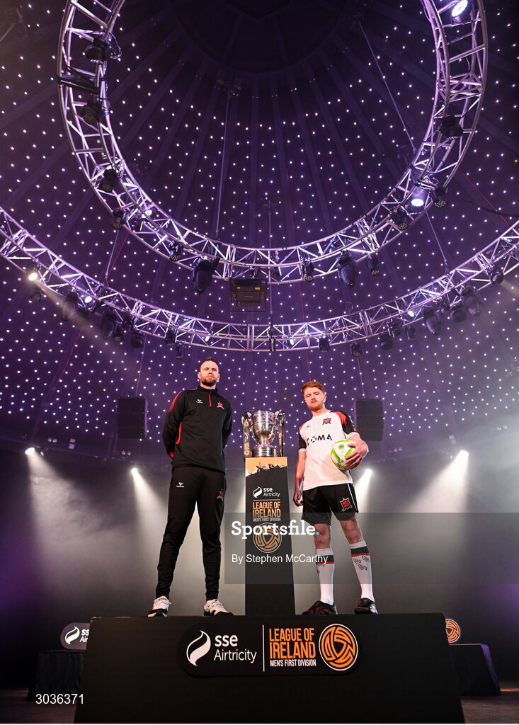 5 February 2025; Dundalk manager Ciaran Kilduff and Aodh Dervin of Dundalk during the SSE Airtricity Men’s Premier Division, SSE Airtricity Men’s First Division and SSE Airtricity Women’s Premier Division Launch 2025 at Mansion House in Dublin. Photo by Stephen McCarthy/Sportsfile