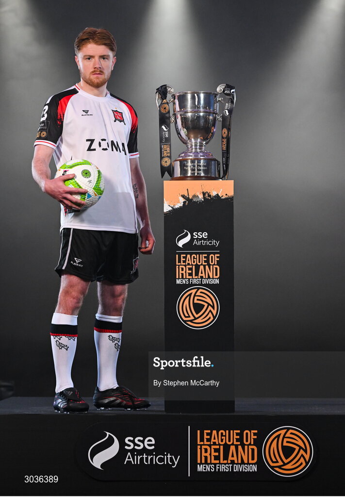 5 February 2025; Aodh Dervin of Dundalk during the SSE Airtricity Men’s Premier Division, SSE Airtricity Men’s First Division and SSE Airtricity Women’s Premier Division Launch 2025 at Mansion House in Dublin. Photo by Stephen McCarthy/Sportsfile