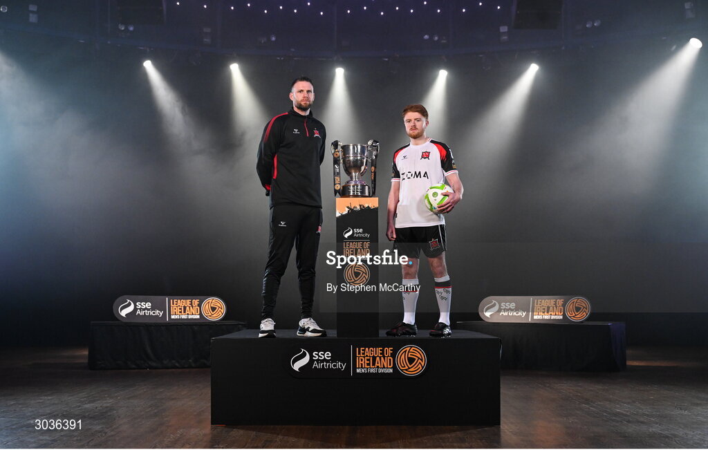 5 February 2025; Dundalk manager Ciaran Kilduff and Aodh Dervin of Dundalk during the SSE Airtricity Men’s Premier Division, SSE Airtricity Men’s First Division and SSE Airtricity Women’s Premier Division Launch 2025 at Mansion House in Dublin. Photo by Stephen McCarthy/Sportsfile