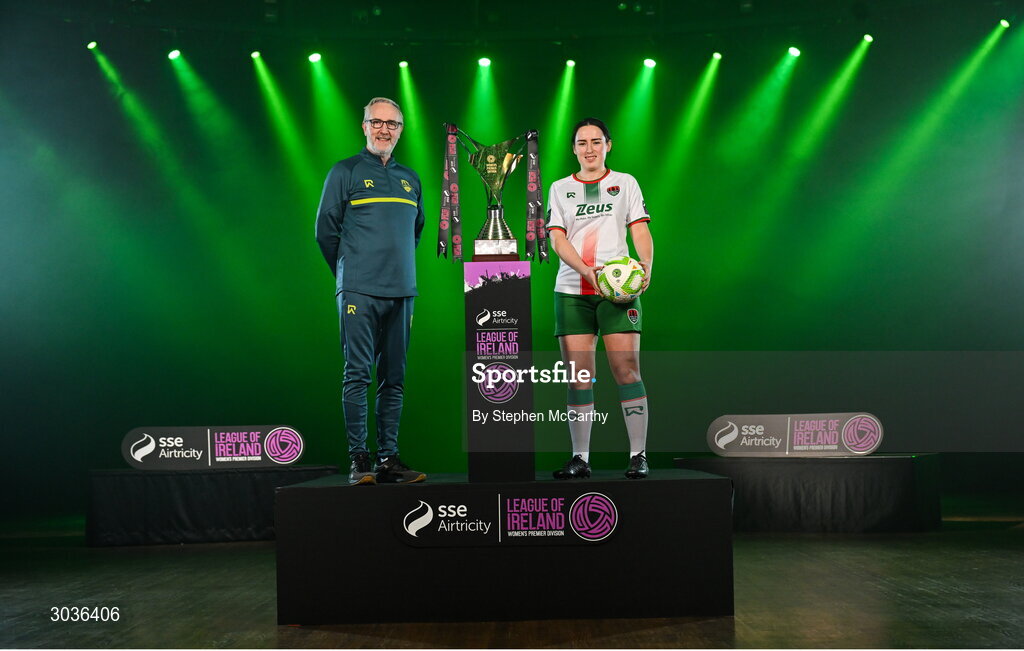 5 February 2025; Cork City manager Frank Kelleher and Ciara McNamara of Cork City during the SSE Airtricity Men’s Premier Division, SSE Airtricity Men’s First Division and SSE Airtricity Women’s Premier Division Launch 2025 at Mansion House in Dublin. Photo by Stephen McCarthy/Sportsfile
