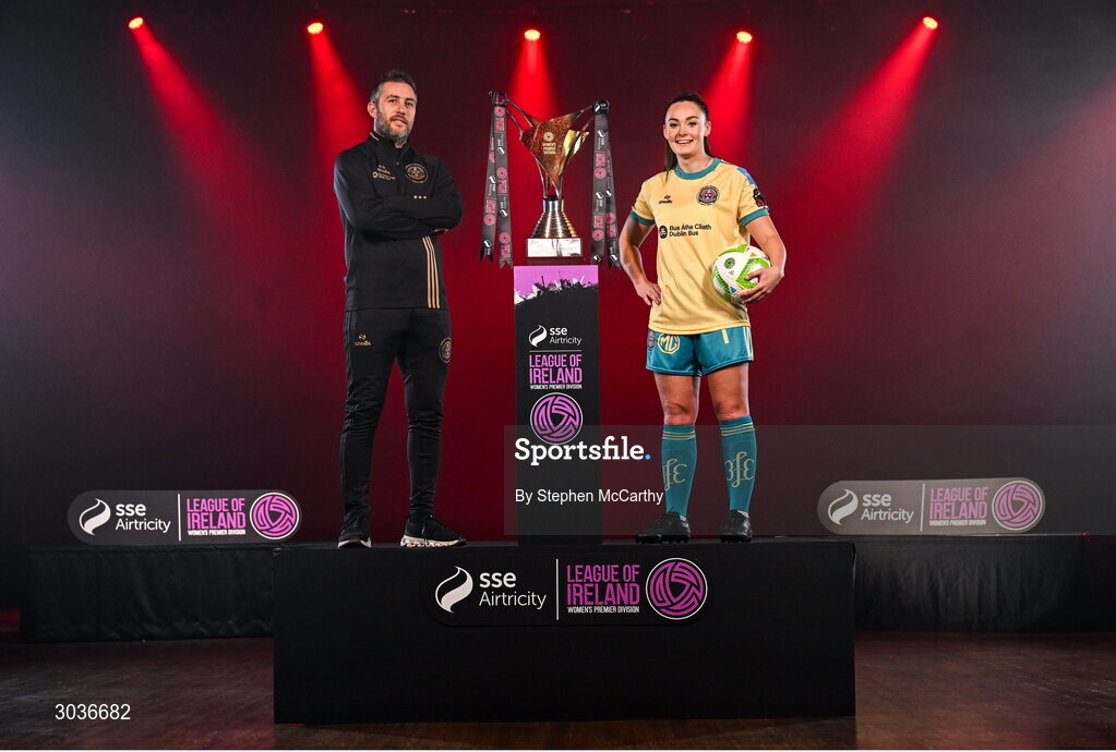 5 February 2025; Bohemians manager Alban Hysa and Rachel Kelly of Bohemians during the SSE Airtricity Men’s Premier Division, SSE Airtricity Men’s First Division and SSE Airtricity Women’s Premier Division Launch 2025 at Mansion House in Dublin. Photo by Stephen McCarthy/Sportsfile