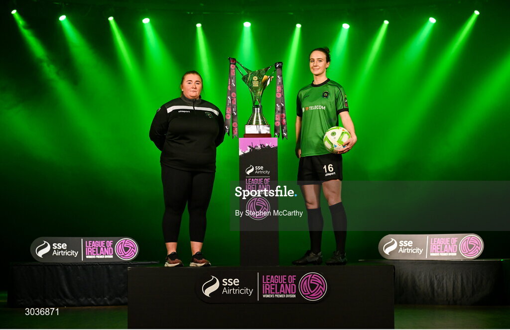 5 February 2025; Peamount United first team coach Emma Donohoe and Karen Duggan of Peamount United during the SSE Airtricity Men’s Premier Division, SSE Airtricity Men’s First Division and SSE Airtricity Women’s Premier Division Launch 2025 at Mansion House in Dublin. Photo by Stephen McCarthy/Sportsfile