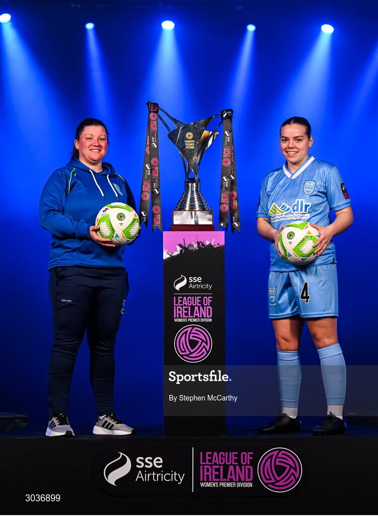 5 February 2025; DLR Waves manager Laura Heffernan and Keelin Dodd of DLR Waves during the SSE Airtricity Men’s Premier Division, SSE Airtricity Men’s First Division and SSE Airtricity Women’s Premier Division Launch 2025 at Mansion House in Dublin. Photo by Stephen McCarthy/Sportsfile
