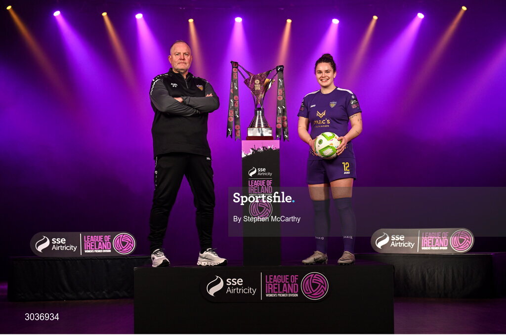 5 February 2025; Wexford goalkeeping coach Pat Trehy and Ciara Rossiter of Wexford during the SSE Airtricity Men’s Premier Division, SSE Airtricity Men’s First Division and SSE Airtricity Women’s Premier Division Launch 2025 at Mansion House in Dublin. Photo by Stephen McCarthy/Sportsfile