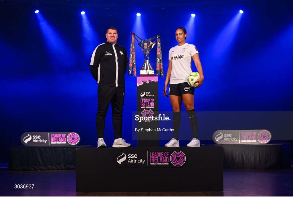5 February 2025; Athlone Town manager Colin Fortune and Izzy Groves of Athlone Town during the SSE Airtricity Men’s Premier Division, SSE Airtricity Men’s First Division and SSE Airtricity Women’s Premier Division Launch 2025 at Mansion House in Dublin. Photo by Stephen McCarthy/Sportsfile