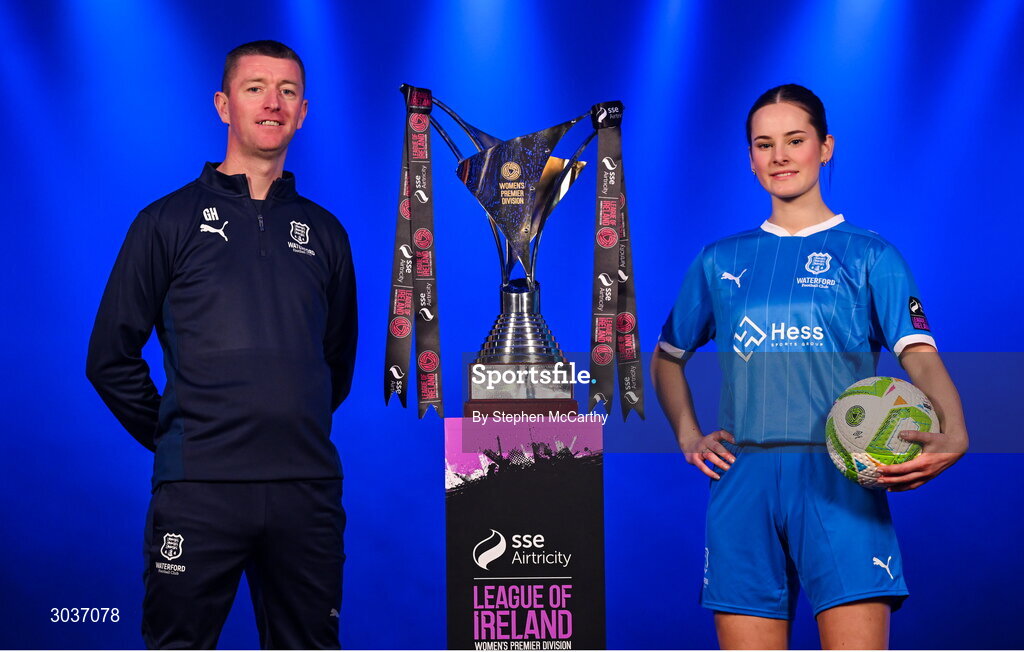 5 February 2025; Waterford head coach Gary Hunt and Danielle Griffin of Waterford during the SSE Airtricity Men’s Premier Division, SSE Airtricity Men’s First Division and SSE Airtricity Women’s Premier Division Launch 2025 at Mansion House in Dublin. Photo by Stephen McCarthy/Sportsfile