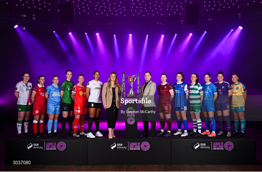 5 February 2025; Ashley Morrow, head of brand, advertising and sponsorship at SSE Airtricity; and League of Ireland director Mark Scanlon with SSE Airtricity Women's Premier Division players, from left, Ciara McNamara of Cork City, Eimear Lafferty of Sligo Rovers, Keelin Dodd of DLR Waves, Karen Duggan of Peamount United, Pearl Slattery of Shelbourne, Izzy Groves of Athlone Town, Lynsey McKey of Galway United, Jillian O'Toole of Treaty United, Aine O'Gorman of Shamrock Rovers, Danielle Griffin of Waterford, Ciara Rossiter of Wexford and Rachel Kelly of Bohemians during the SSE Airtricity Men’s Premier Division, SSE Airtricity Men’s First Division and SSE Airtricity Women’s Premier Division Launch 2025 at Mansion House in Dublin. Photo by Stephen McCarthy/Sportsfile