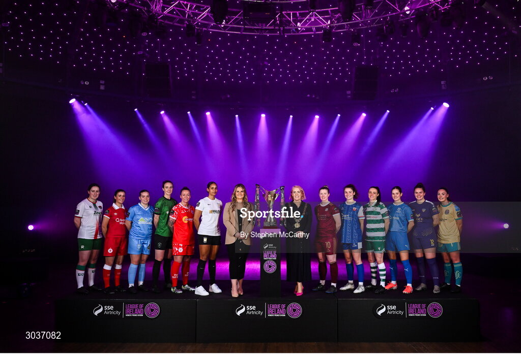 5 February 2025; Ashley Morrow, head of brand, advertising and sponsorship at SSE Airtricity; left, and Lord Mayor of Dublin Emma Blain with SSE Airtricity Women's Premier Division players, from left, Ciara McNamara of Cork City, Eimear Lafferty of Sligo Rovers, Keelin Dodd of DLR Waves, Karen Duggan of Peamount United, Pearl Slattery of Shelbourne, Izzy Groves of Athlone Town, Lynsey McKey of Galway United, Jillian O'Toole of Treaty United, Aine O'Gorman of Shamrock Rovers, Danielle Griffin of Waterford, Ciara Rossiter of Wexford and Rachel Kelly of Bohemians during the SSE Airtricity Men’s Premier Division, SSE Airtricity Men’s First Division and SSE Airtricity Women’s Premier Division Launch 2025 at Mansion House in Dublin. Photo by Stephen McCarthy/Sportsfile
