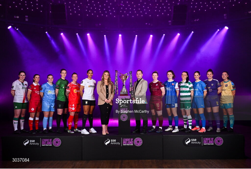 5 February 2025; Ashley Morrow, head of brand, advertising and sponsorship at SSE Airtricity; and League of Ireland director Mark Scanlon with SSE Airtricity Women's Premier Division players, from left, Ciara McNamara of Cork City, Eimear Lafferty of Sligo Rovers, Keelin Dodd of DLR Waves, Karen Duggan of Peamount United, Pearl Slattery of Shelbourne, Izzy Groves of Athlone Town, Lynsey McKey of Galway United, Jillian O'Toole of Treaty United, Aine O'Gorman of Shamrock Rovers, Danielle Griffin of Waterford, Ciara Rossiter of Wexford and Rachel Kelly of Bohemians during the SSE Airtricity Men’s Premier Division, SSE Airtricity Men’s First Division and SSE Airtricity Women’s Premier Division Launch 2025 at Mansion House in Dublin. Photo by Stephen McCarthy/Sportsfile