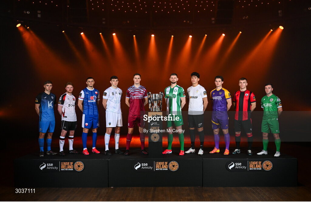 5 February 2025; SSE Airtricity Men's First Division players, from left, Anto Dodd of Finn Harps, Aodh Dervin of Dundalk, Yoyo Mahdy of Treaty United, Eanna Clancy of UCD, Cian Coleman of Cobh Ramblers, Killian Cantwell of Bray Wanderers, German Fuentes Rodriguez of Athlone Town, Aaron Dobbs of Wexford, Dean O'Shea of Longford Town and Sean McGrath of Kerry during the SSE Airtricity Men’s Premier Division, SSE Airtricity Men’s First Division and SSE Airtricity Women’s Premier Division Launch 2025 at Mansion House in Dublin. Photo by Stephen McCarthy/Sportsfile