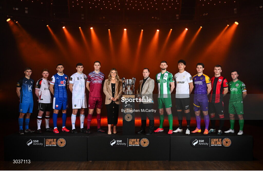 5 February 2025; Ashley Morrow, head of brand, advertising and sponsorship at SSE Airtricity; and League of Ireland director Mark Scanlon with SSE Airtricity Men's First Division players, from left, Anto Dodd of Finn Harps, Aodh Dervin of Dundalk, Yoyo Mahdy of Treaty United, Eanna Clancy of UCD, Cian Coleman of Cobh Ramblers, Killian Cantwell of Bray Wanderers, German Fuentes Rodriguez of Athlone Town, Aaron Dobbs of Wexford, Dean O'Shea of Longford Town and Sean McGrath of Kerry during the SSE Airtricity Men’s Premier Division, SSE Airtricity Men’s First Division and SSE Airtricity Women’s Premier Division Launch 2025 at Mansion House in Dublin. Photo by Stephen McCarthy/Sportsfile