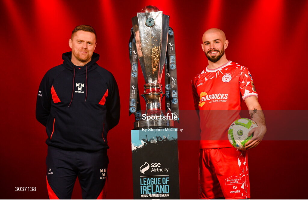 5 February 2025; Shelbourne manager Damien Duff and Mark Coyle of Shelbourne during the SSE Airtricity Men’s Premier Division, SSE Airtricity Men’s First Division and SSE Airtricity Women’s Premier Division Launch 2025 at Mansion House in Dublin. Photo by Stephen McCarthy/Sportsfile