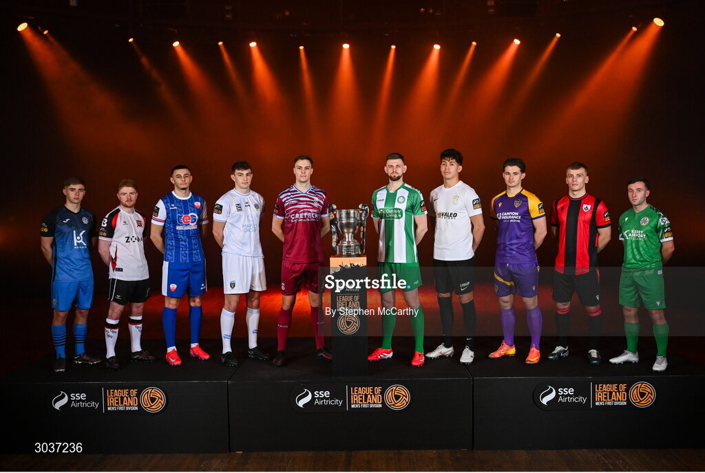 5 February 2025; SSE Airtricity Men's First Division players, from left, Anto Dodd of Finn Harps, Aodh Dervin of Dundalk, Yoyo Mahdy of Treaty United, Eanna Clancy of UCD, Cian Coleman of Cobh Ramblers, Killian Cantwell of Bray Wanderers, German Fuentes Rodriguez of Athlone Town, Aaron Dobbs of Wexford, Dean O'Shea of Longford Town and Sean McGrath of Kerry during the SSE Airtricity Men’s Premier Division, SSE Airtricity Men’s First Division and SSE Airtricity Women’s Premier Division Launch 2025 at Mansion House in Dublin. Photo by Stephen McCarthy/Sportsfile