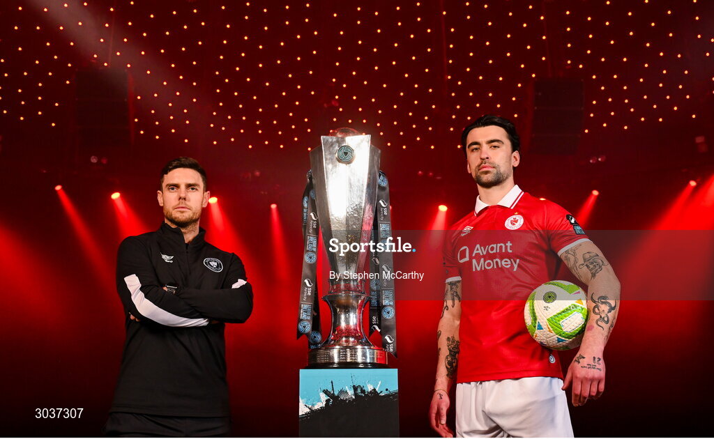 5 February 2025; Sligo Rovers manager John Russell and John Mahon of Sligo Rovers during the SSE Airtricity Men’s Premier Division, SSE Airtricity Men’s First Division and SSE Airtricity Women’s Premier Division Launch 2025 at Mansion House in Dublin. Photo by Stephen McCarthy/Sportsfile