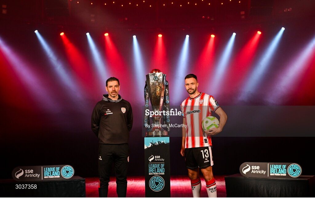 5 February 2025; Derry City manager Tiernan Lynch and Robbie Benson of Derry City during the SSE Airtricity Men’s Premier Division, SSE Airtricity Men’s First Division and SSE Airtricity Women’s Premier Division Launch 2025 at Mansion House in Dublin. Photo by Stephen McCarthy/Sportsfile